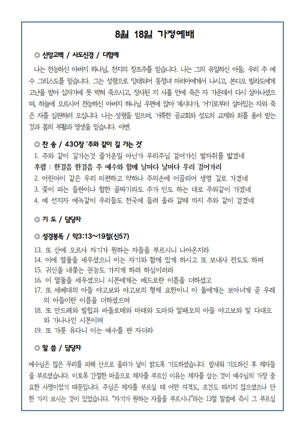8월 18일 가정예배순서지