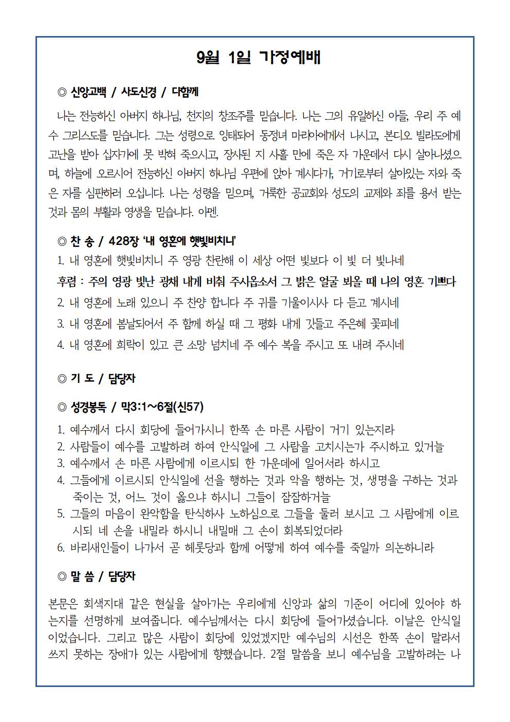 9월 1일 가정예배순서지