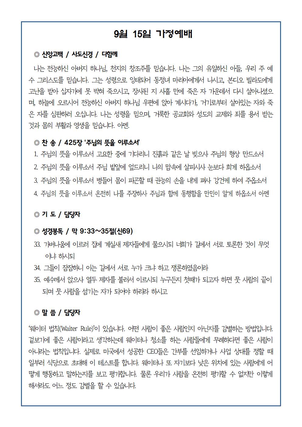 9월 15일 가정예배순서지