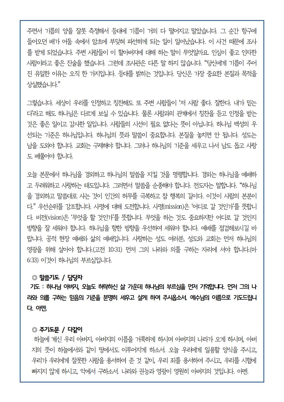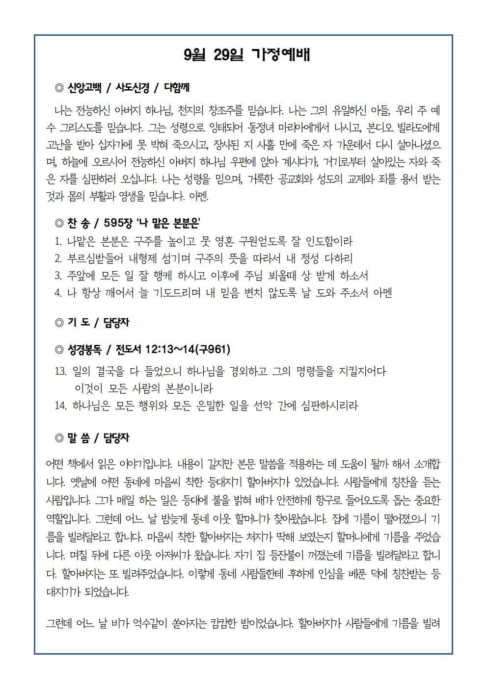 9월 29일 가정예배순서지